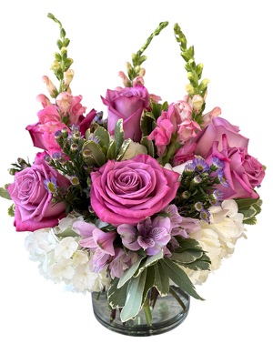 a lush low compact cylinder vase with hydrangea, roses, alstromeria, snap dragons and filler. In purples and pinks.