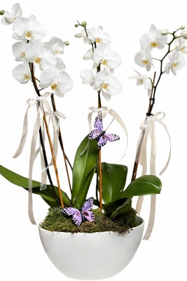 Two white double-stemmed phalaenopsis orchids (4 stalks) planted in a modern ceramic boat planter. It's easy to take care of and lovely to look at. Elevated with moss, butterflies, and ribbons.