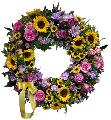 Yellows, pinks, and lavenders. This is a matching piece to the Spring Meadow Casket spray.
