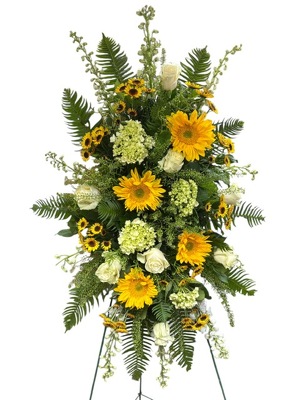 standing spray with assorted yellow, white, and green flowers. To include sunflowers, hydrangea, delphinium, roses, sundi poms, and filler.