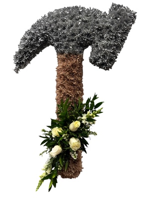 Custom shaped hammer displayed on an easel.