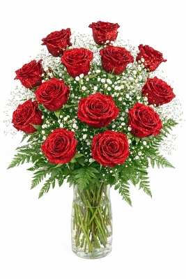 12 long stem red GLITTER roses in a vase with mixed greens and babies breath.
