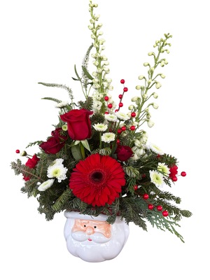 This is a keepsake ceramic santa container. Designed with assorted red and white blooms.