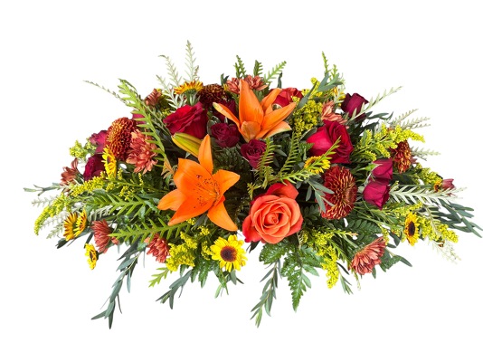A long and low centerpiece arrangement filled with fall bloom such as roses, lilies, mums, spray roses, solidago, and mixed foliage. Great for a long dining table.